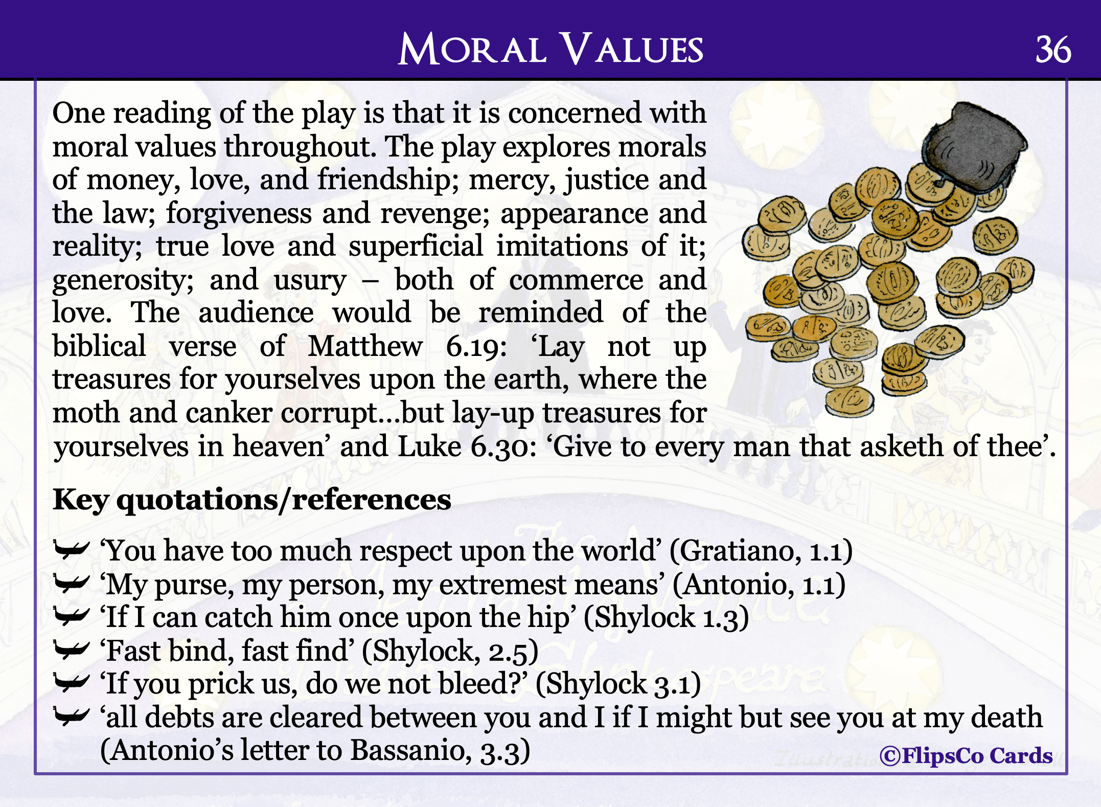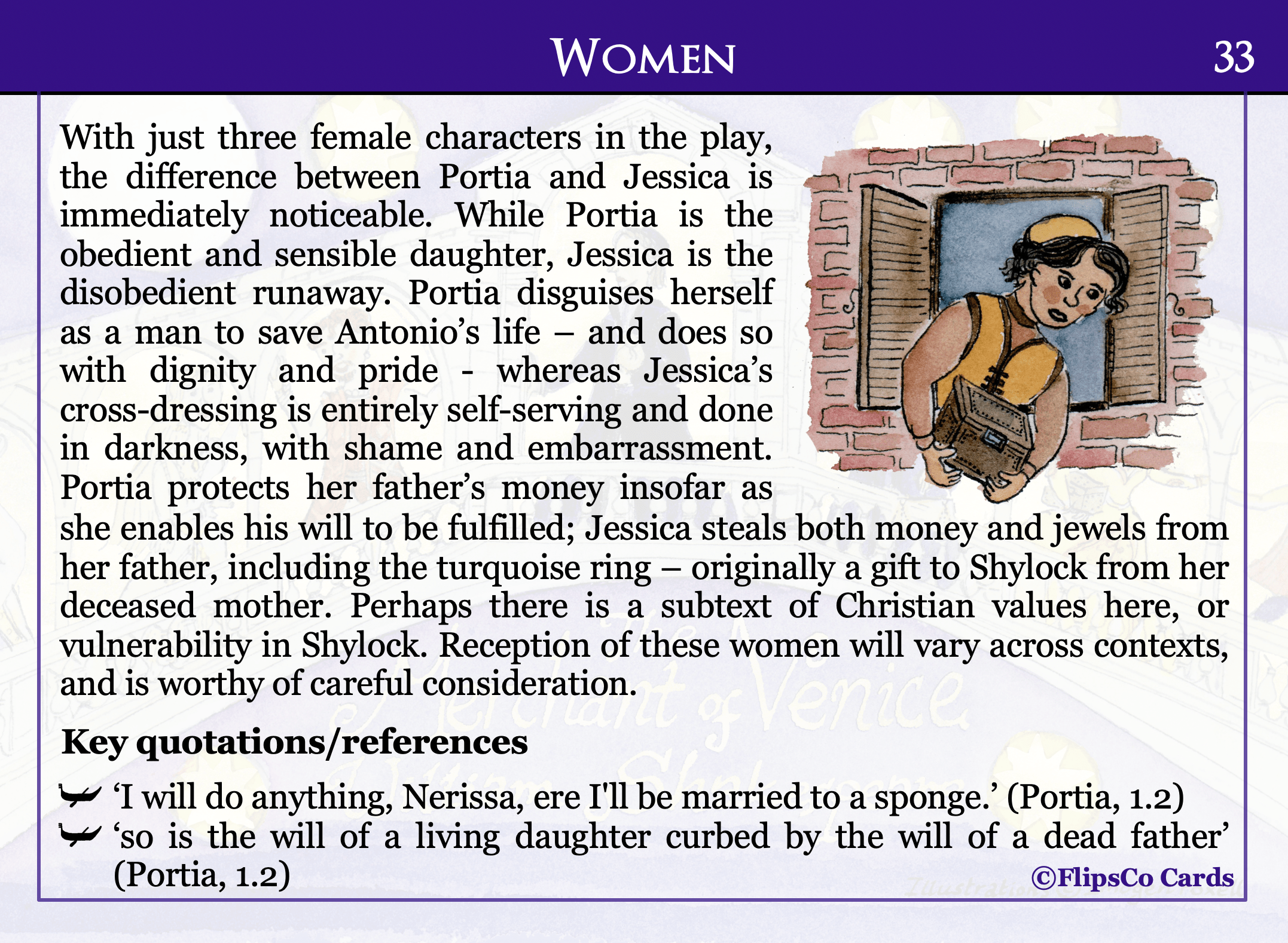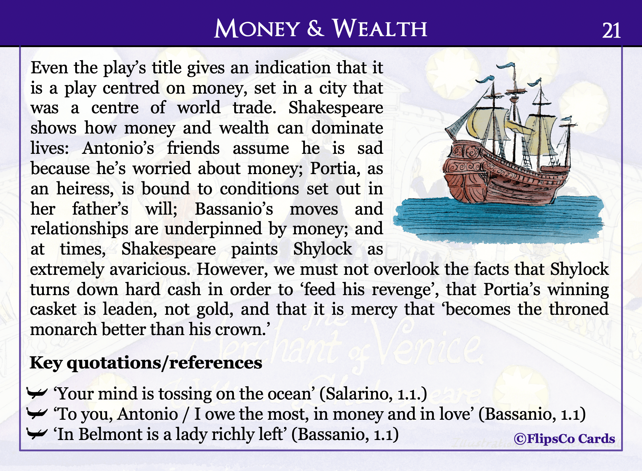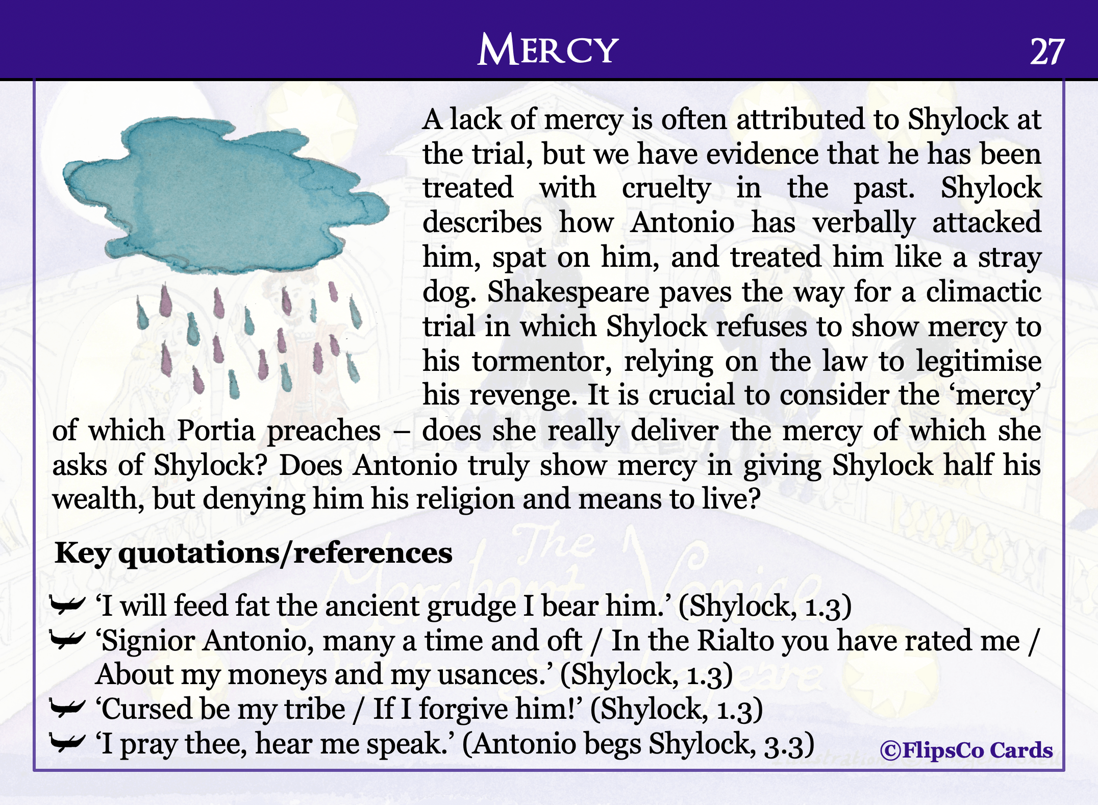 The Merchant of Venice GCSE English Literature revision cards (20 x A6 double sided). Content includes a critical analysis of each character and theme, as well as a wider reading list, plot summary, contextual information, analysis of allusions, and key vocabulary.