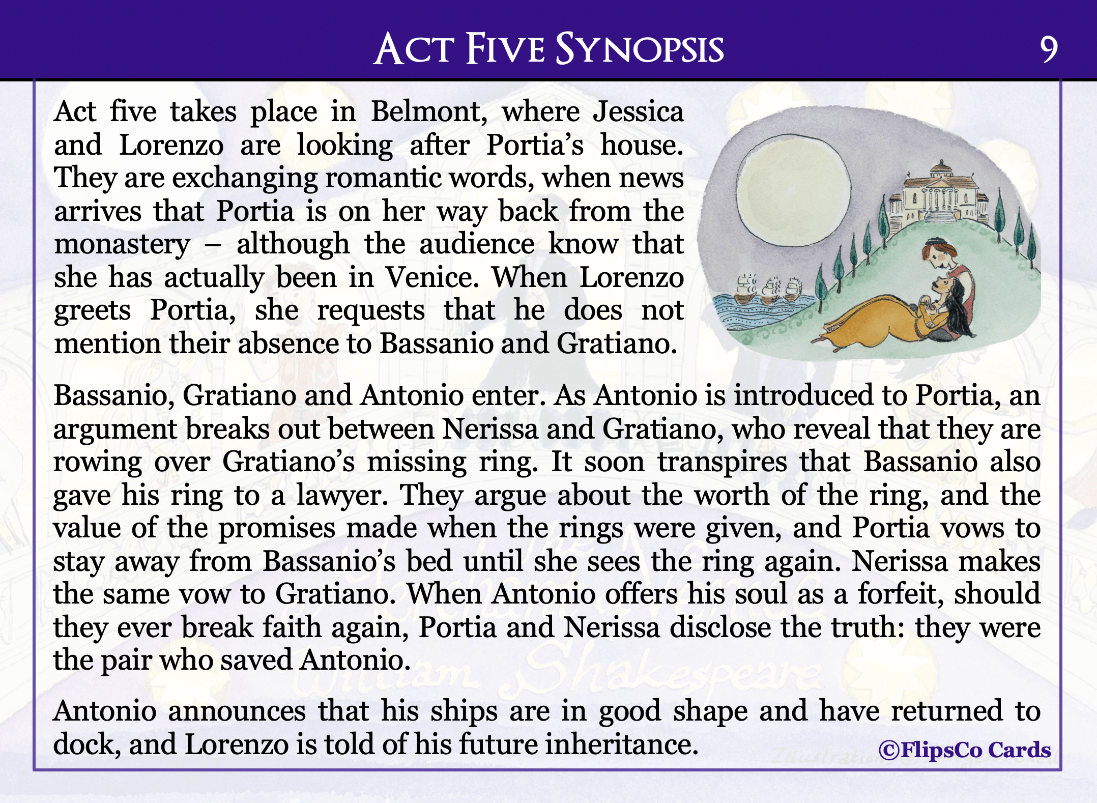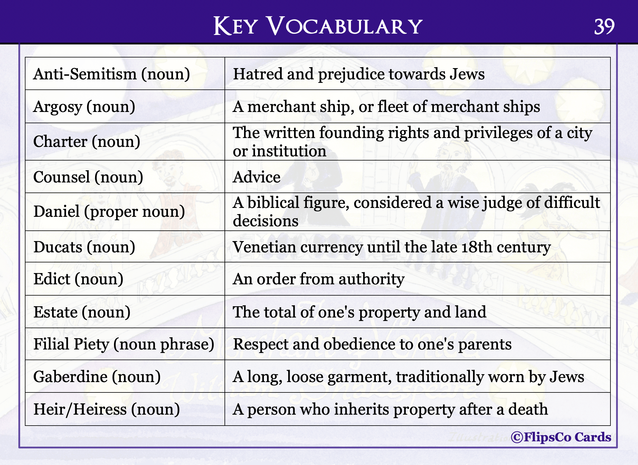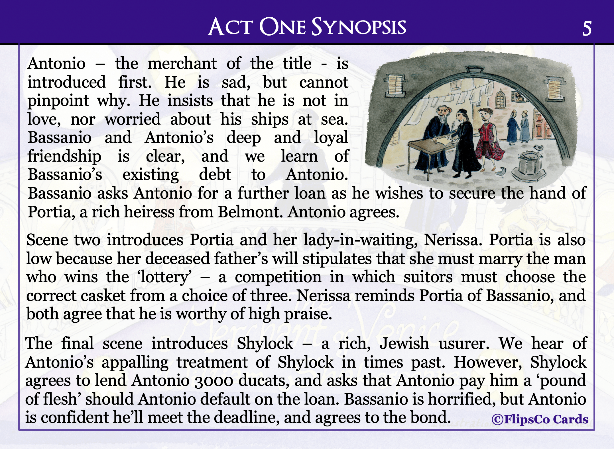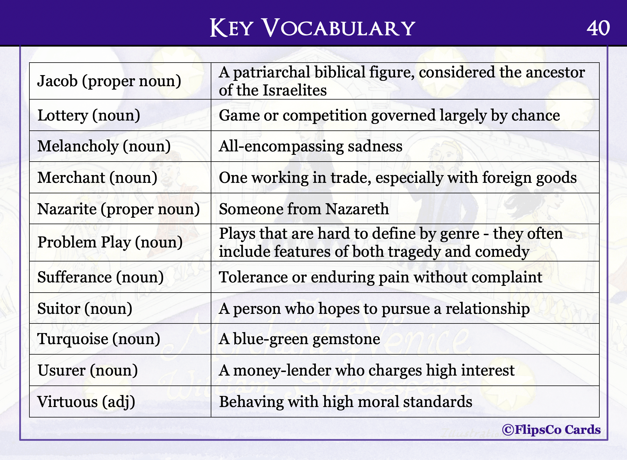 The Merchant of Venice GCSE English Literature revision cards (20 x A6 double sided). Content includes a critical analysis of each character and theme, as well as a wider reading list, plot summary, contextual information, analysis of allusions, and key vocabulary.